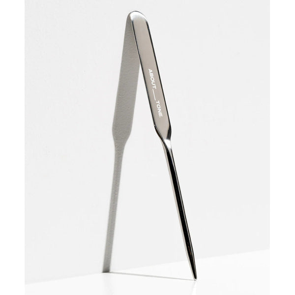 This ABOUT_TONE spatula is constructed from durable stainless steel for long-lasting use in your beauty routine. It is specifically designed to help you achieve an even and flawless application of liquid foundation across the face. Use this tool to avoid the common issues of clumping or cakey buildup during blending.