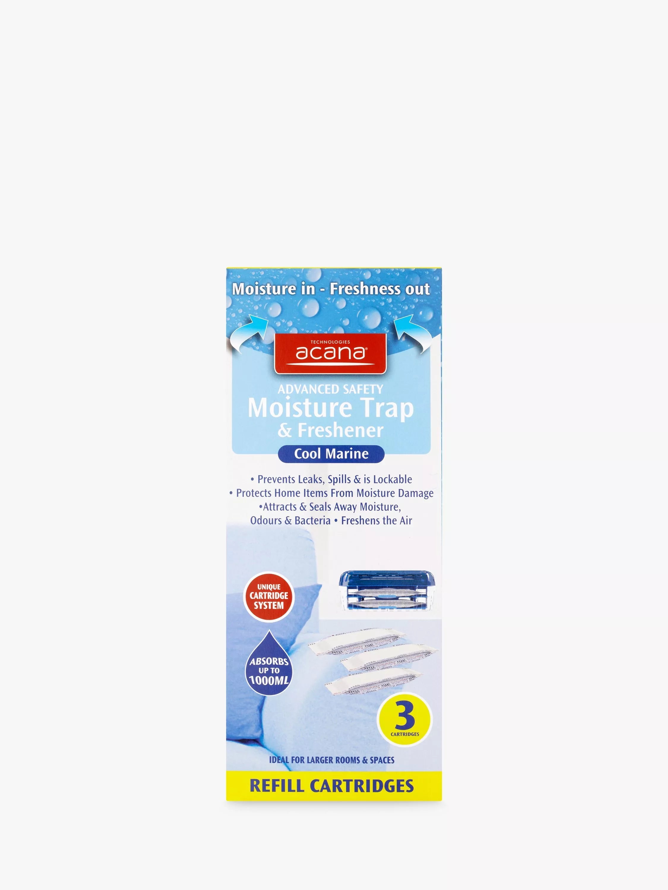 Each cartridge can absorb up to 1000ml of moisture and helps to trap and lock in moisture, odours and bacteria. The unique sealed cartridge system ensures there are no leaks or spills, making them safe to use all over your home, plus the cartridges leave behind a cool marine fragrance.