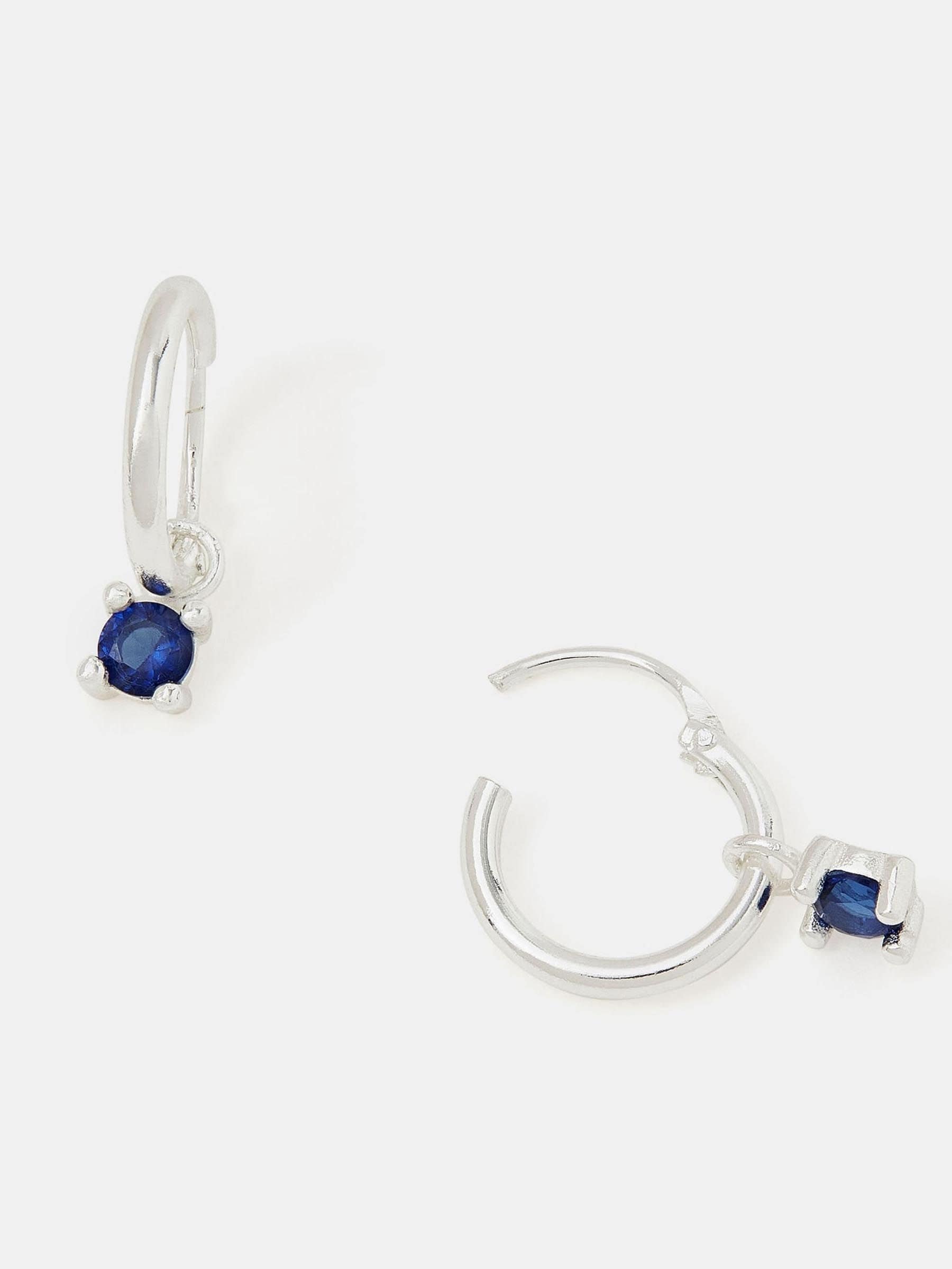 Crafted in sterling silver, these earrings are a must-have for your earscape. In a blue to match the deep ocean waters, these they showcase a diamante stone dangling from the small hoop. Non-refundable. Read More