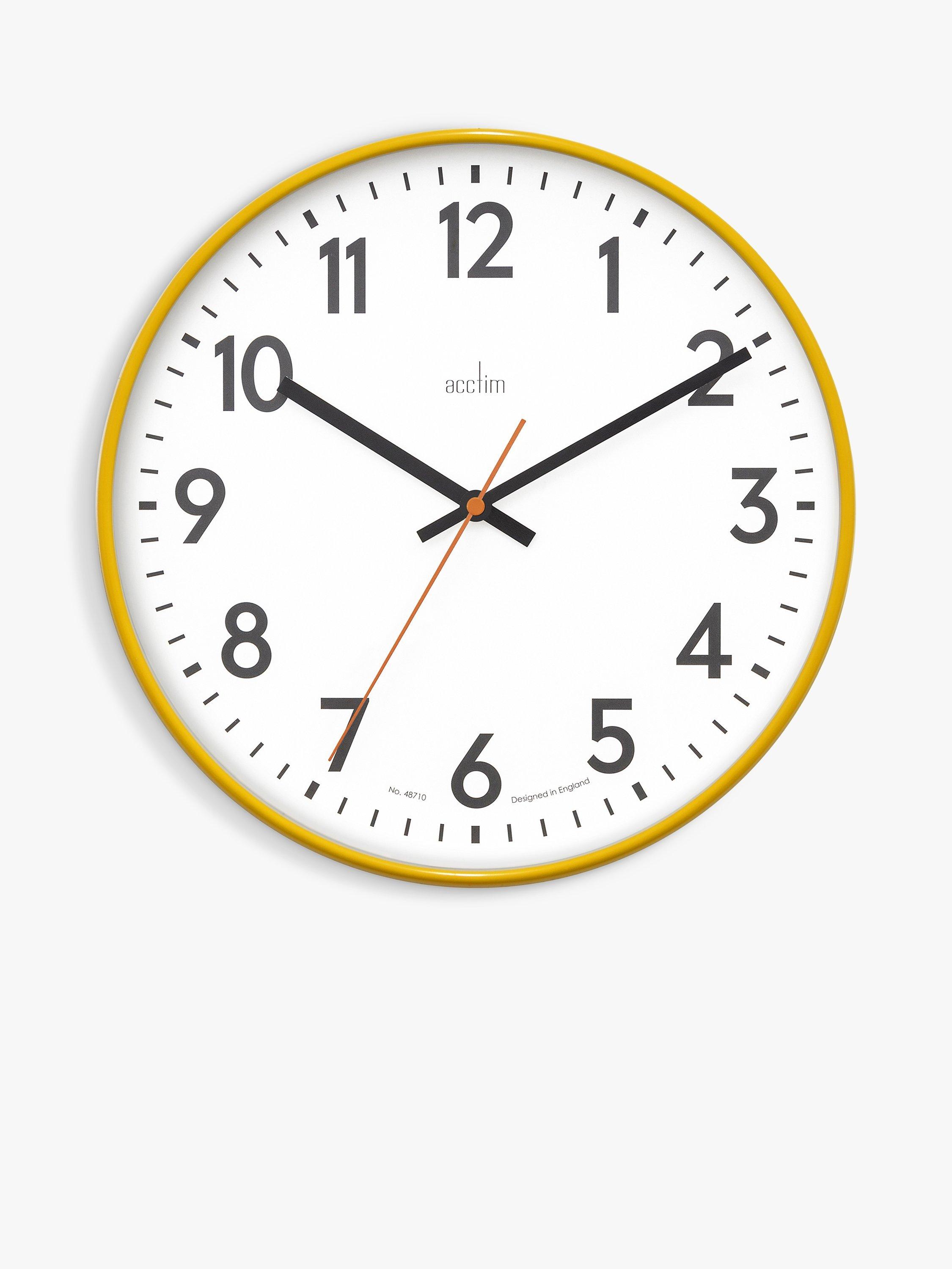 The Acctim Hugo Analogue Wall Clock, sized at 30Cm, presents an industrial aesthetic with a modern vibrant casing finish. Its face features prominent Arabic numerals ensuring clear visibility behind a protective glass lens. This reliable timepiece offers consistent accuracy for any room display today.