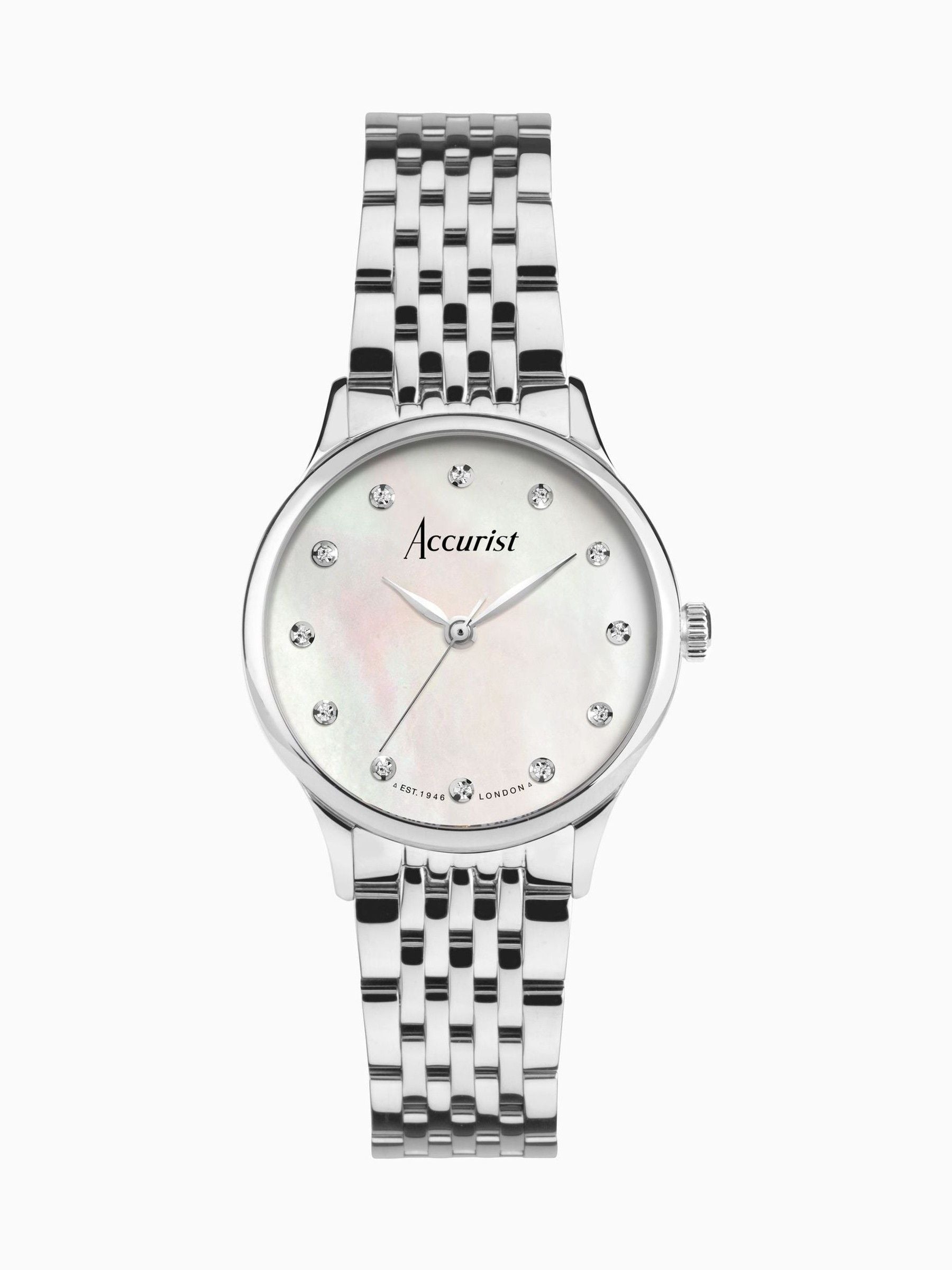 The watch is fastened with an interchangeable solid stainless steel bracelet and is water resistant up to 50 metres. Adorn your wrist with a flawless, British designed dress watch.