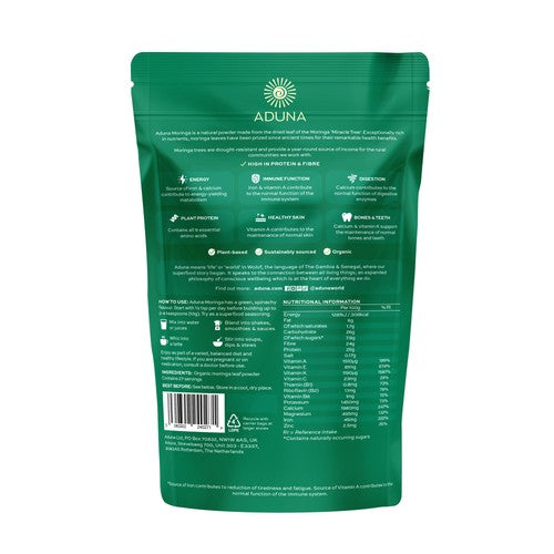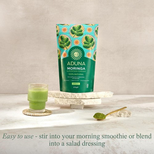 Read MoreDiscover Aduna Moringa. The 100% organic green superfood made from the naturally dried leaf of the Moringa tree, one of the most nutrient-dense foods on the planet. It is rich in protein, iron, vitamin A and vitamin K and source of vitamin E, calcium and magnesium. Moringa trees are drought-resistant and provie a year-round source of income for the communities Aduna works with. No wonder it's called The Miracle Tree!