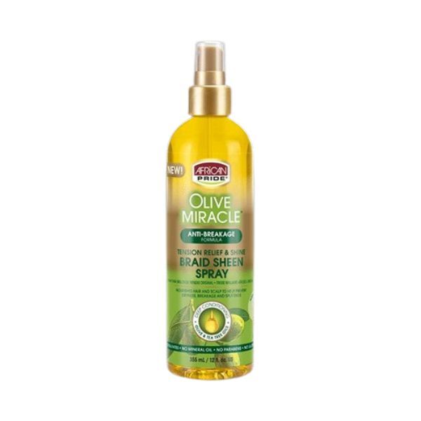 african pride olive miracle antibreakage braid sheen spray is detailed with rich extra virgin olive oil to help support hair from the root