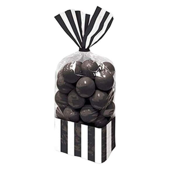 These Amscan Stripe items are presented as a pack of 10. They feature dark chocolate spheres gathered in clear cellophane bags for easy viewing. The packaging is finished with a striking black and white vertical stripe design at the base and top. This stylish presentation makes them suitable for various celebratory occasions.