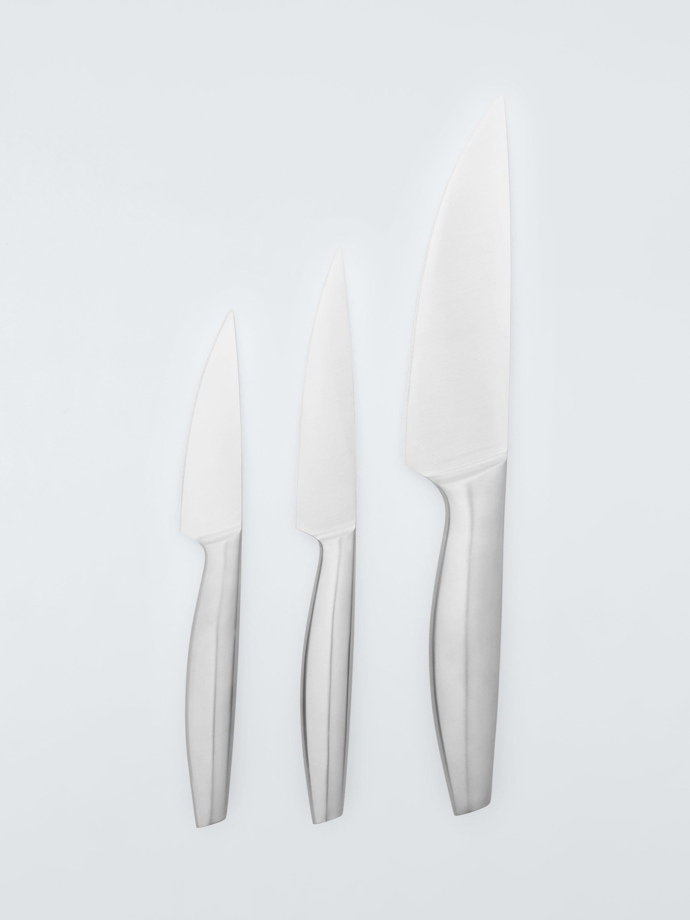 This Anyday Stainless Steel Kitchen Knife Set features three essential implements for comprehensive food preparation tasks across the kitchen. The versatile collection comprises a cook's knife, a utility knife, and a precision paring knife, all built with forged blades for quality. Each piece ensures consistent cutting performance.