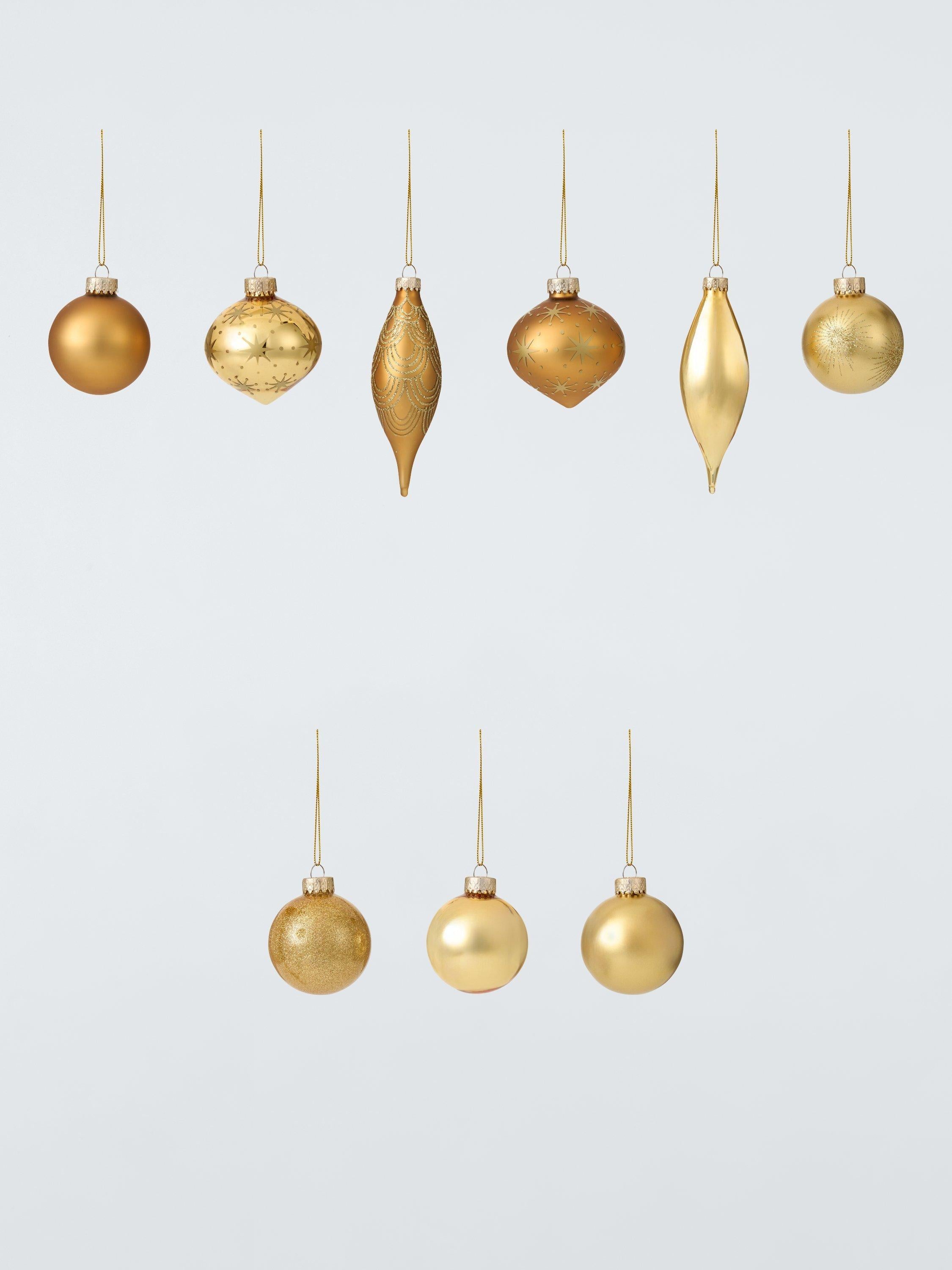Read More20 glass Christmas baubles in gold tones, intricately decorated with a mixture of high shine and matt finishes.