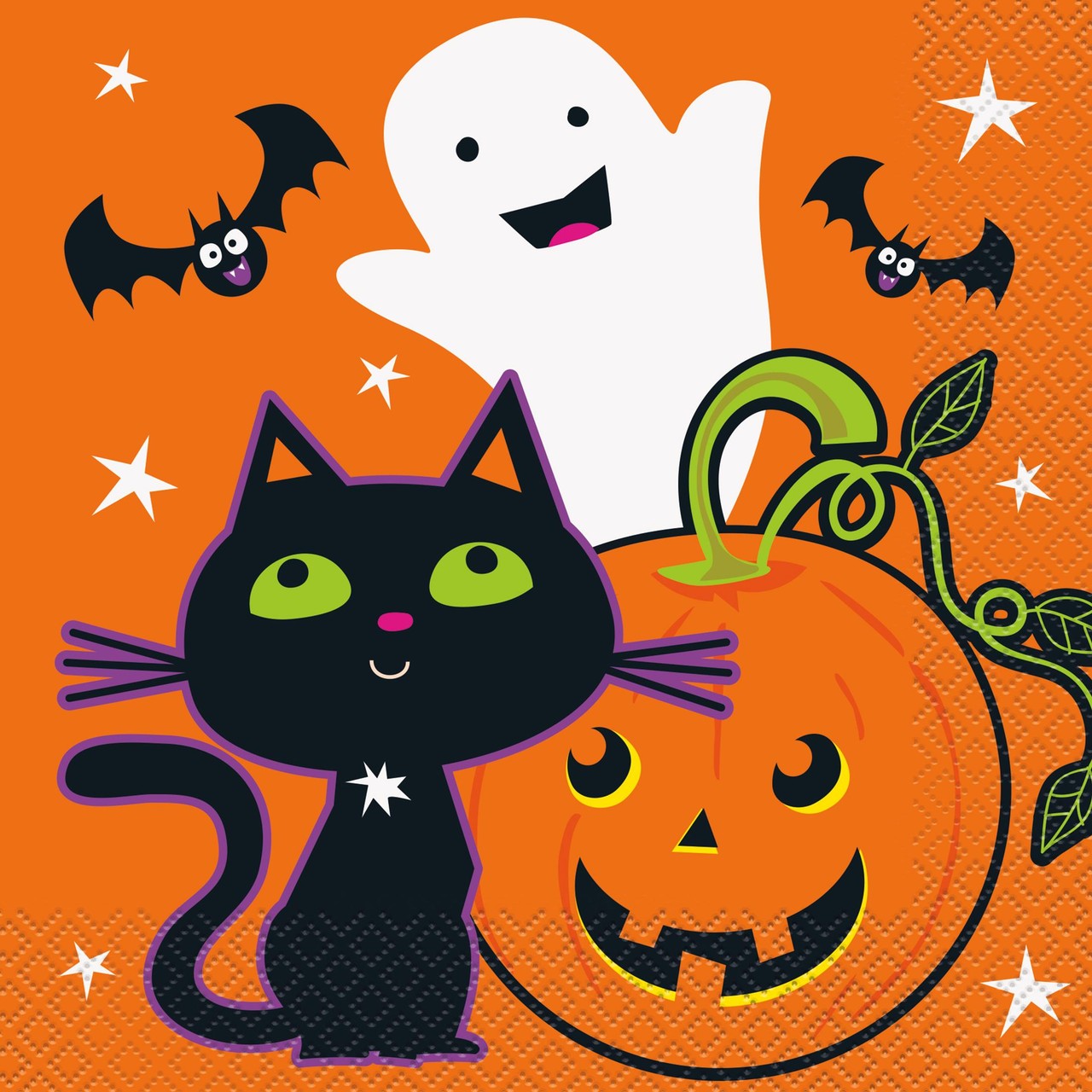 These Bats & Friends luncheon napkins are designed to add a cute, spooky touch to your table setting. Featuring black cats, ghosts, pumpkins, and bats, these napkins suit children's Halloween celebrations perfectly. The 2-ply material offers reliable absorption for small messes during the event.