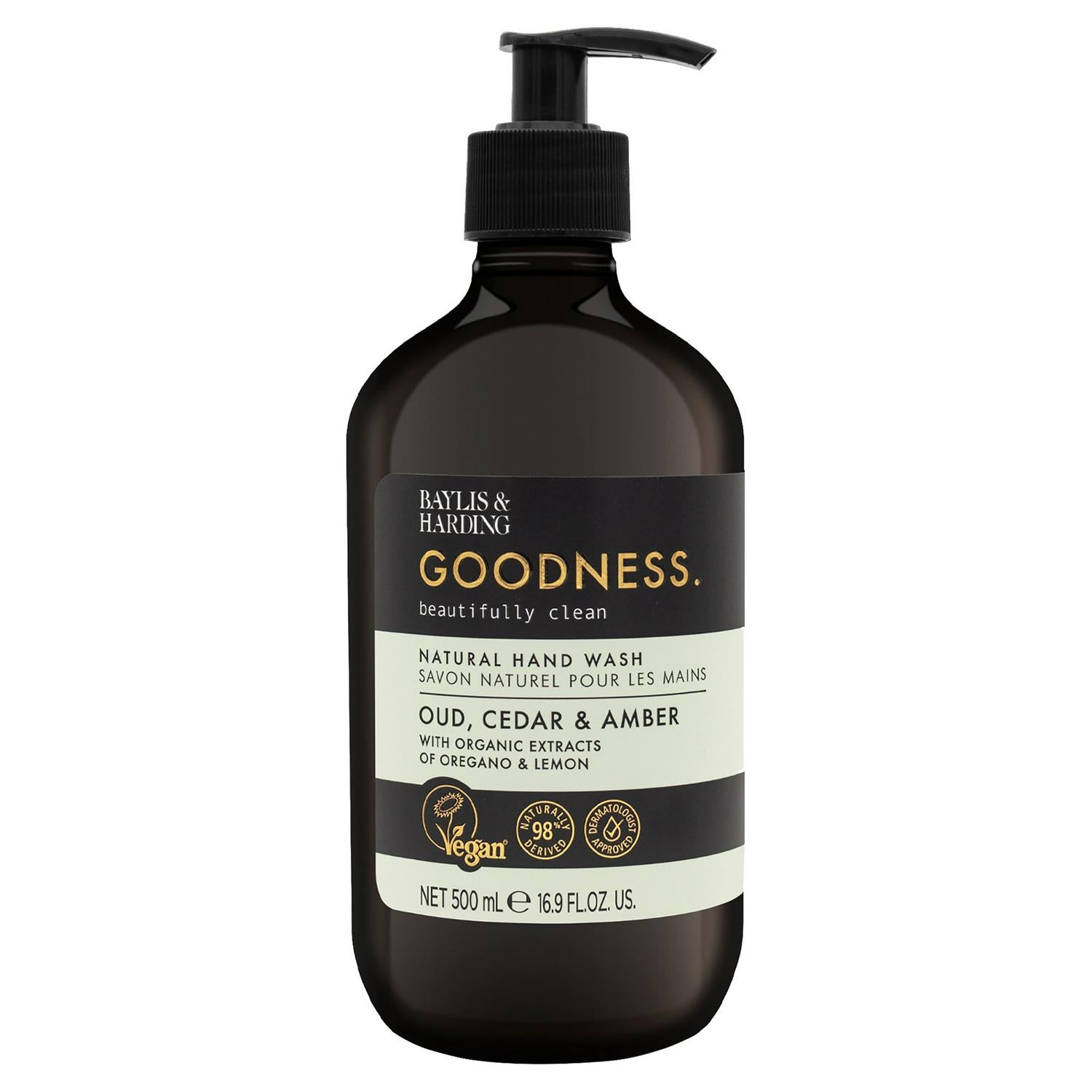 Experience the deeply aromatic fragrance of Baylis & Harding Goodness Oud & Cedar Natural Hand Wash. This 500ml formulation is designed to gently cleanse your skin while offering a subtle sensory uplift. The blend features rich notes of Oud, Cedar, and Amber for a distinctive, enveloping scent.