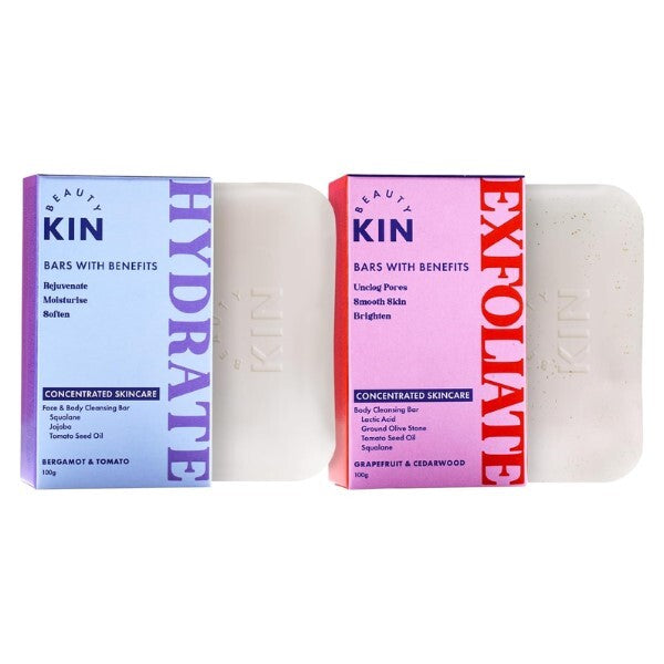 This Beauty Kin bundle features two full-sized bars engineered to refine and deeply moisturise your skin effectively. The set includes the Exfoliate Bar, the Hydrate Bar, and a complimentary Kin Pouch for comprehensive support. Achieve noticeably smoother results through this dual-action system designed for gentle, targeted care.