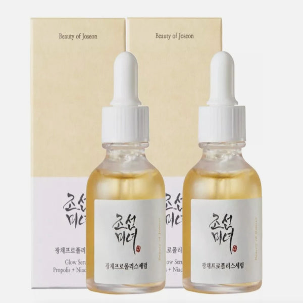 This value pack provides two units of the Beauty of Joseon Glow Serum, formulated with Propolis and Niacinamide. This product is specifically designed to help you achieve a healthy, radiant complexion. The serum aims to deliver a desirable 'honey skin' appearance while addressing common skin concerns.