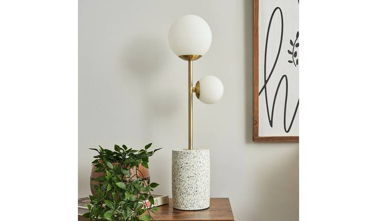 This two-light Fleur table lamp has a quirky and unusual design thanks to the spherical lights and the silver-flecked cylinder base. The slim fit features a gold-finished leg, adding a contrasting touch to this quirky piece. Perfect for a bedside table, this modern lamp adds lots of unique personality and interest to your bedroom.