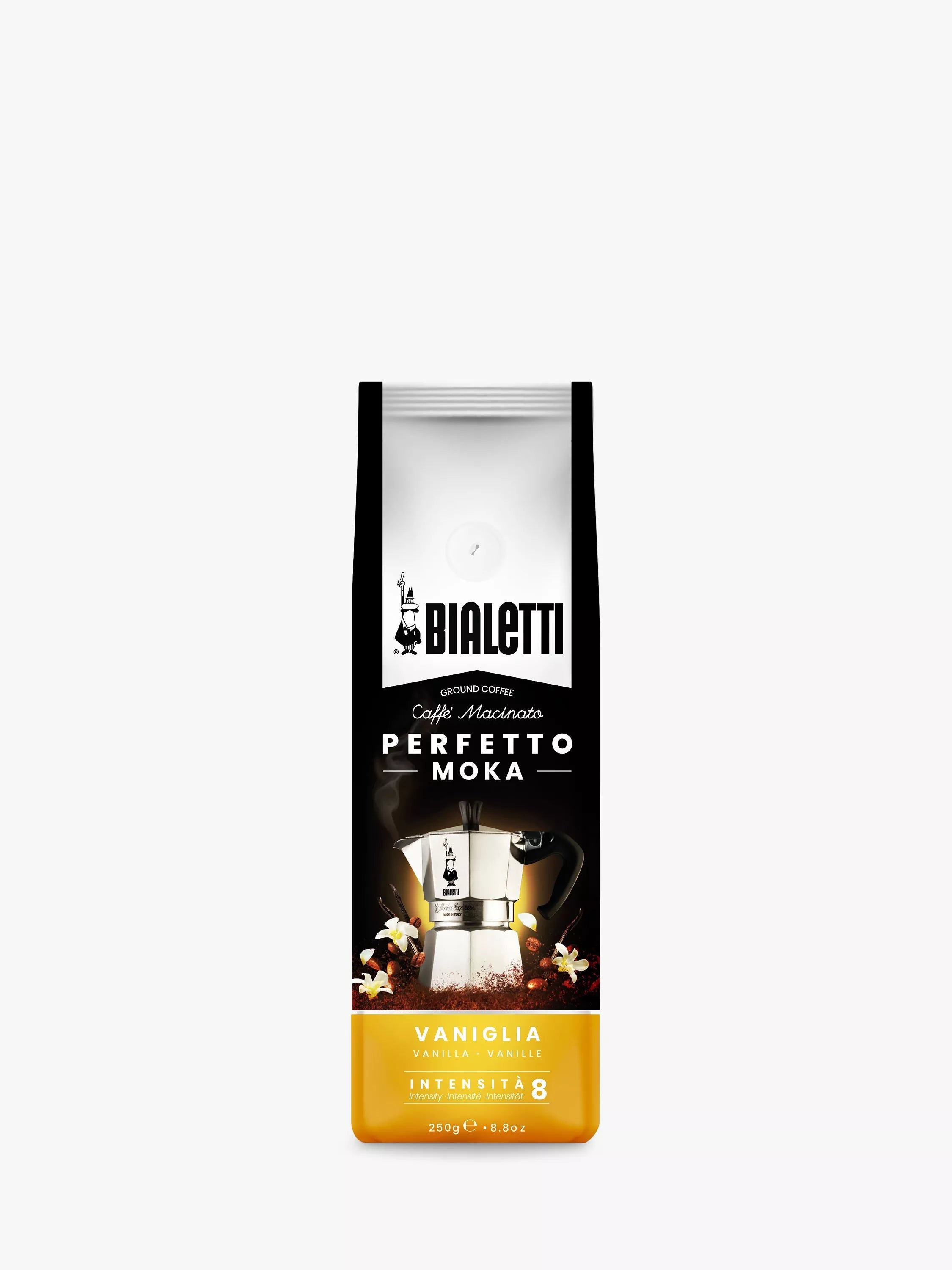 Bialetti's Moka Perfetto Vaniglia ground coffee is an aromatic blend from arabica coffee beans, perfectly suited to Bialetti's Moka coffee maker. Its delicate structure is enhanced by a vanilla-flavoured, sweet, delicate taste. Perfetto Moka Vaniglia adds the best vanilla beans to a long, structured Italian roast for a fragrant coffee, just slightly different to your usual.