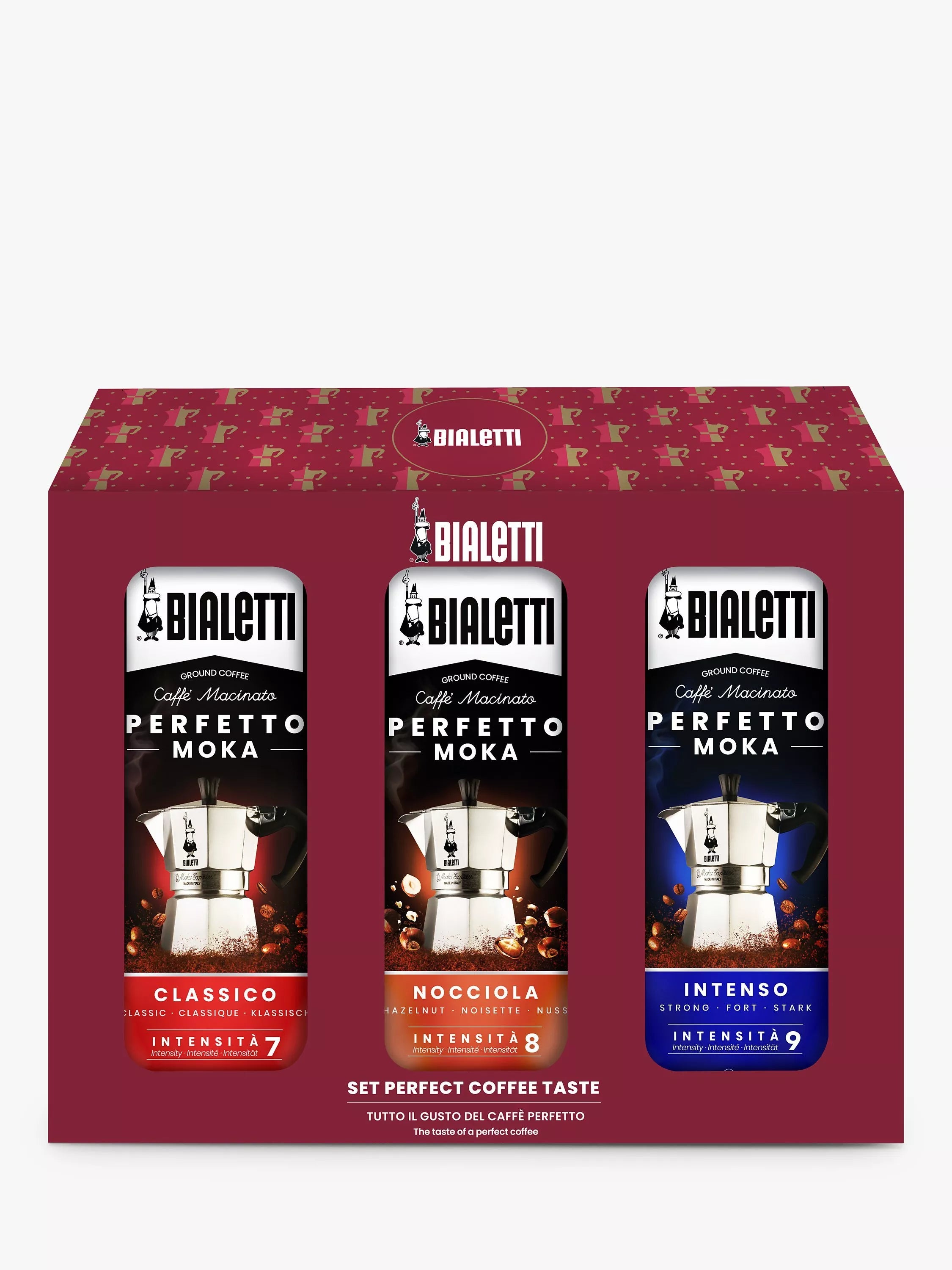 Bialetti's Perfetto Moka gift set gives you the taste of three types of ground coffee, traditionally roasted in Italy, to brew barista-style in your Bialetti Moka coffee maker.