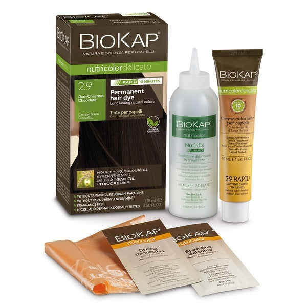 formulated without paraphenylenediamines ppd or other chemical irritants the biokap nutricolor rapid formula dyes your hair perfectly in just 10 minutes rich in vegetable ingredients to nourish hair and argan oil for extra shine this hair dye deeply conditions while covering greys perfectly and provides long lasting natural colour biokap nutricolor delicato rapid is furthermore enriched with organic argan oil and the exclusive tricorepair complex and to strengthen and protect hair and scalp all hair colours are dermatologically tested and nickel tested 1 ppm warm bright and naturallooking permanent hair colours in just 10 minutes 100 grey coverage nourishing colouring repairing with organic argan oil and our botanical tricorepair complex high natural formula free from ppd resorcin ammonia sls sles and parabens leaves hair soft shiny and healthy nickel tested minimises irritation and allergy risks
