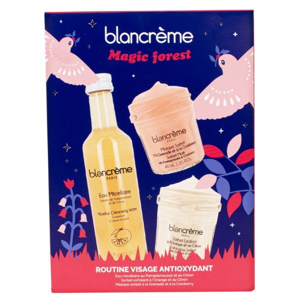 An antioxidant skincare trio: micellar water with citrus extracts, exfoliating sorbet with fruit acids, and a sorbet mask with cranberry and pomegranate for smooth, radiant skin.