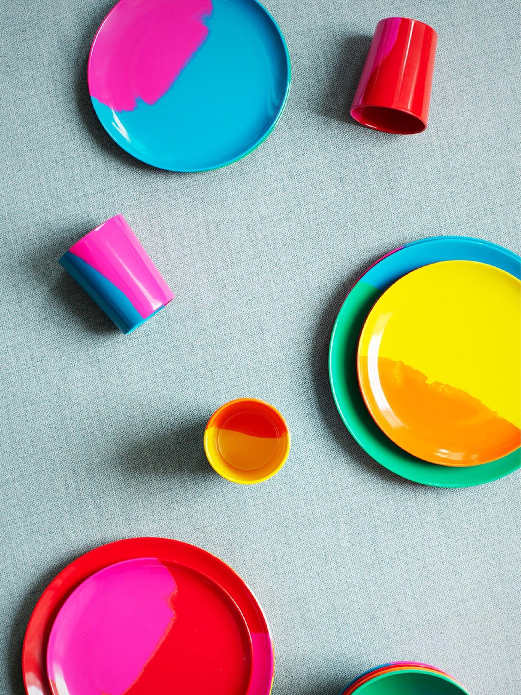 Dame Prue Leith is thrilled with her exquisite collection of brightly coloured melamine tableware called Pure Prue. This set of sixteen pieces includes 4 tumblers, 4 bowls, 4 side plates & 4 dinner plates and are hand moulded so variations in pattern and colour will occur - each piece is unique and suitable for indoor or outdoor use.