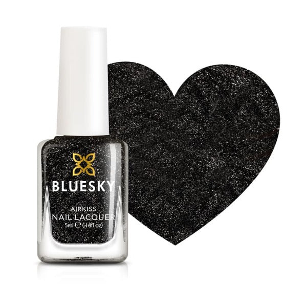 Bluesky Kids Airkiss Nail Polish in the Rock Star shade offers a striking cosmetic option for children. This formulation presents a deep black base colour that is generously speckled with fine silver glitter. This polish enables younger users to easily achieve expressive and themed nail art looks for various occasions.