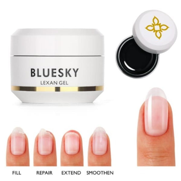 fix fill sculpt shape smooth and extend with lexan gel a bluesky innovation that will change your manicure as you know it our versatile lexan gel can be used in a variety of different ways to enhance your nails specifically developed for salon use to save you time whilst maintaining excellent longlasting results for every manicure for best results use with bluesky base coat top coat