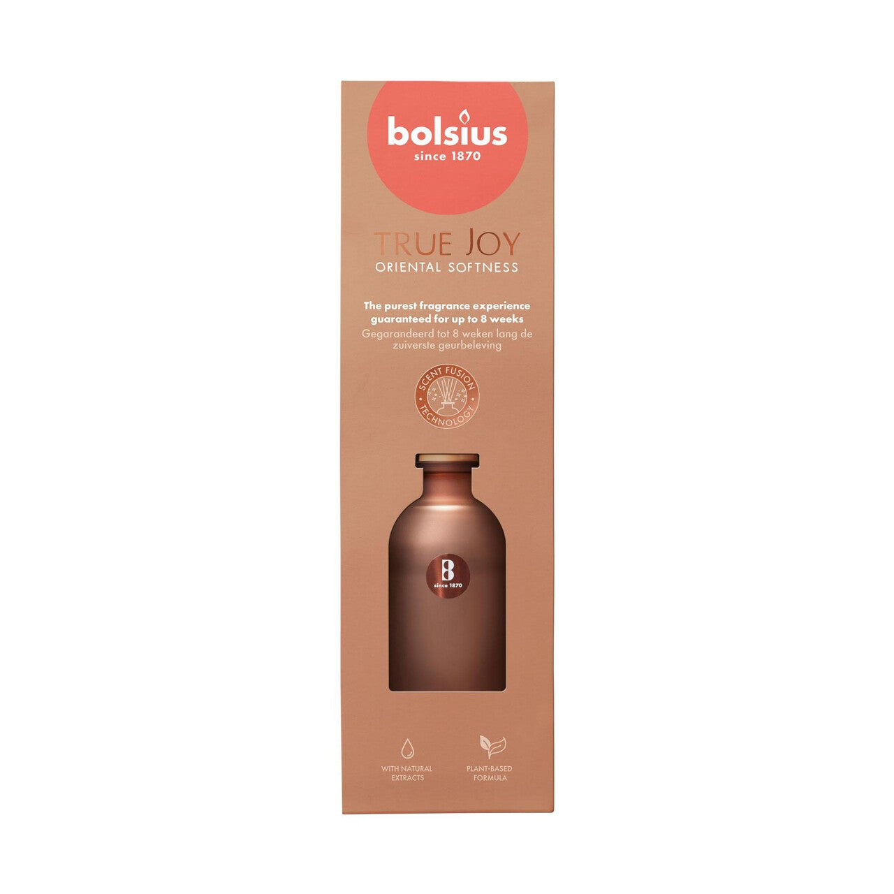 Enjoy a moment of calm with the Bolsius True Joy Diffuser in Oriental Softness. This reed diffuser subtly disperses a rich, calming scent inspired by an oriental garden in bloom. Bolsius focuses on quality, using only the best raw materials and natural extracts for an authentic aroma.