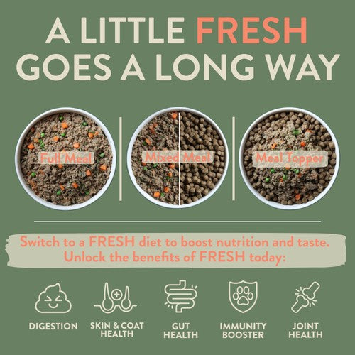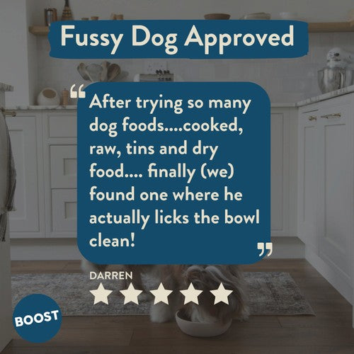 This BOOST Pet meal features chicken prepared to high human quality standards, offering your dog honest nutrition. It is gently cooked and then frozen fresh to lock in quality for serving. This preparation approach aligns closely with how nature intended whole food to be presented to pets.