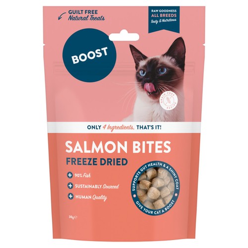 Offer your cat a highly nutritious snack with these Boost Pet Freeze Dried Salmon Treats. The gentle freeze-drying process is specifically used to help preserve essential nutrients within the ingredients.