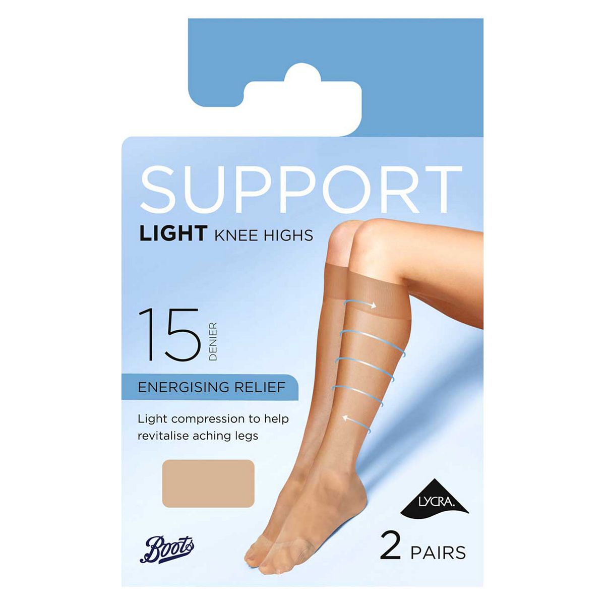 Boots 15 denier light support knee highs 2 pair pack in shade natural tan. These light support knee highs give gentle, graduated compression to your ankles and calfs and are wide fit in size to extra comfort.