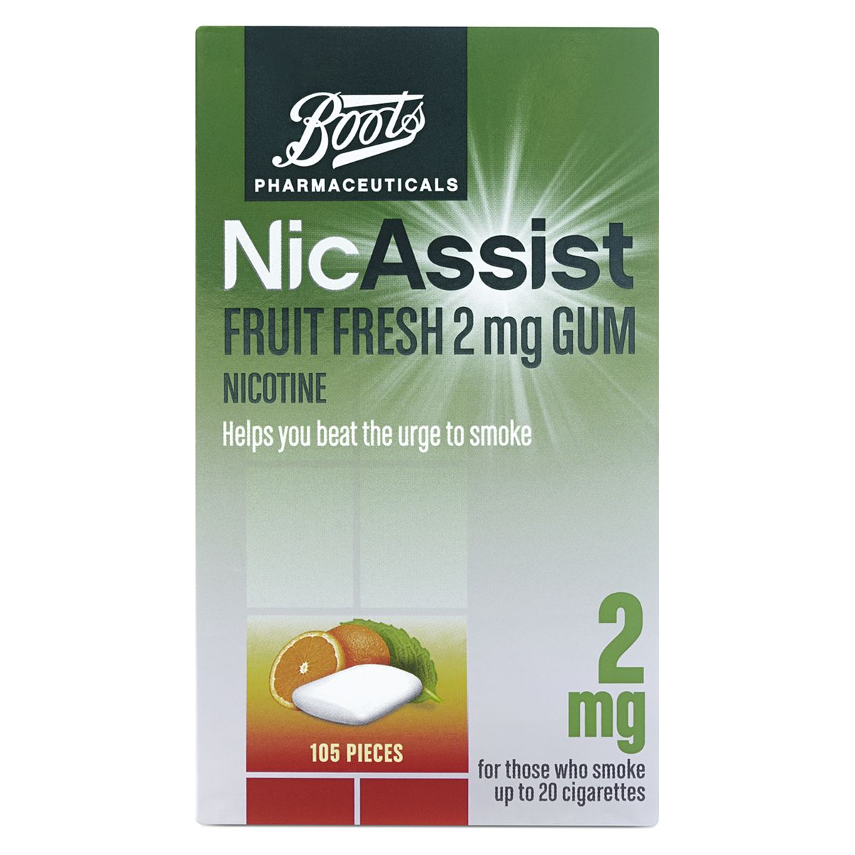 Active Ingredient: Each medicated chewing gum contains Nicotine 2mg.Also contains: Chewing Gum base (containing Butylated Hydroxytoluene E321), Xylitol, Peppermint Oil, Sodium Carbonate, Sodium Bicarbonate, Acesulfame Potassium, Levomenthol, Magnesium Oxide, Talc, Flavour (Tuttifrutti), Hypromellose, Sucralose, Polysorbate 80, Purified Water, Acacia, Titanium Dioxide (E171), Carnauba Wax.