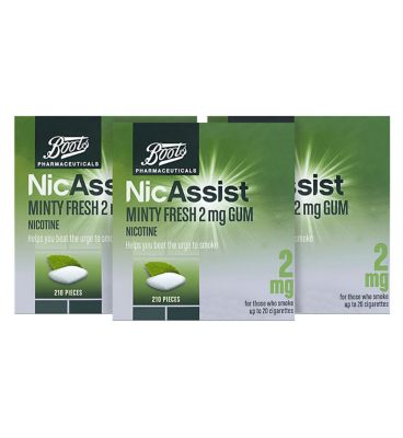 Three packs of Boots NicAssist Minty Fresh 2mg Gum Helps you beat the urge to smoke. For those who smoke up to 20 cigarettes.Always read the label. Requires willpower