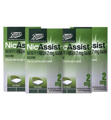 This bundle contains: Four packs of Boots NicAssist Minty Fresh 2 mg Gum - 105 piecesHelps you beat the urge to smoke. For those who smoke up to 20 cigarettes.Always read the label. Requires willpower.