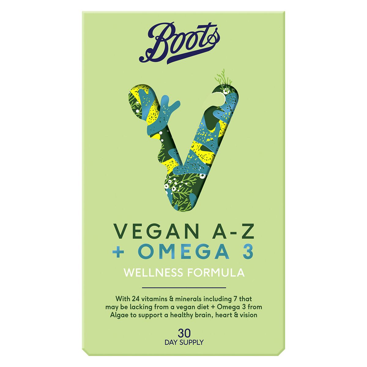 Vegan Multivitamin and Mineral Food Supplement with Algal EPA & DHA, 30 Tablets + 30 CapsulesWith 24 vitamins & minerals including 7 that may be lacking from a vegan diet, + Omega 3 from algae to support a healthy brain, heart & visionWhat does it do?Vegan A-Z Tablet:Packed with 24 vitamins and minerals, including 7 key nutrients that can be hard to get in sufficient quantities from a plant-based diet alone: Vitamins B12 and D3, Selenium, Calcium, Iodine, Iron and Zinc. Due to the importance of B12 in a Vegan diet in particular, we have formulated to a higher strength to reduce tiredness and fatigue, while also supporting a healthy immune system and nervous system.