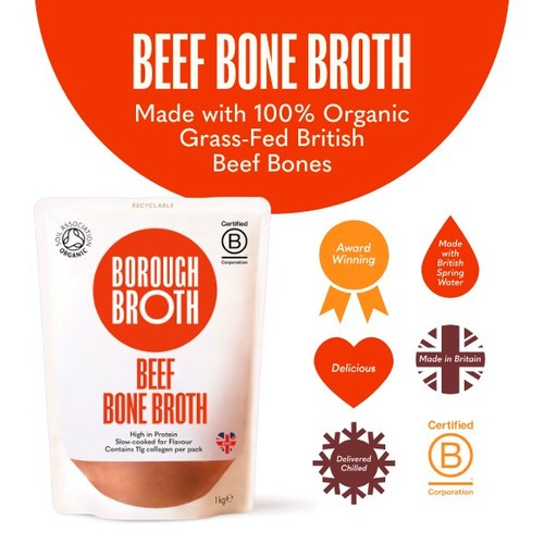 This Borough Broth is crafted using organic ingredients, slow-cooked overnight for up to 24 hours to maximise flavour and nutrient extraction. It is a nutritious addition to your chilled food selection, recognised with a Great Taste 2017 award.
