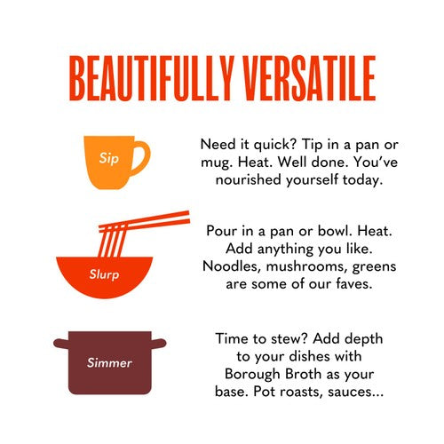 Seasoned just right, our broths are designed for sipping, slurping or cooking. There are plenty of recipes on boroughbroth.co.uk if you're in need of inspiration.