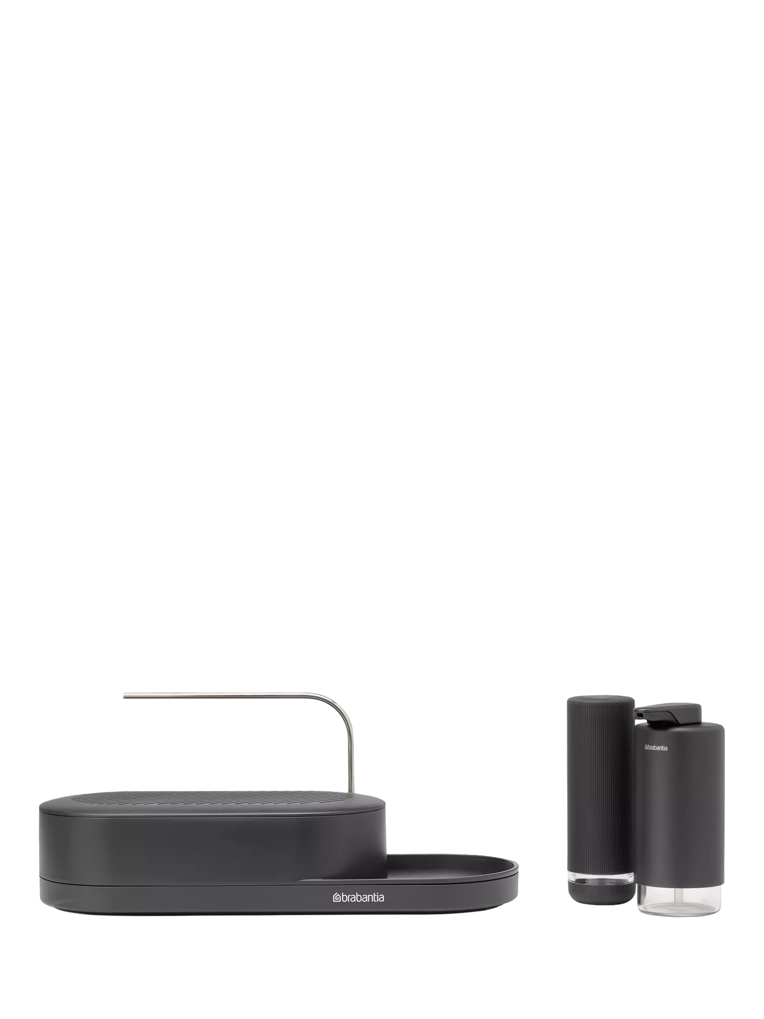 The separate non-skid tray with silicone liner keeps it in place, together with the matching soap dispenser and soap squeezer - great for your hand and dish soap.
