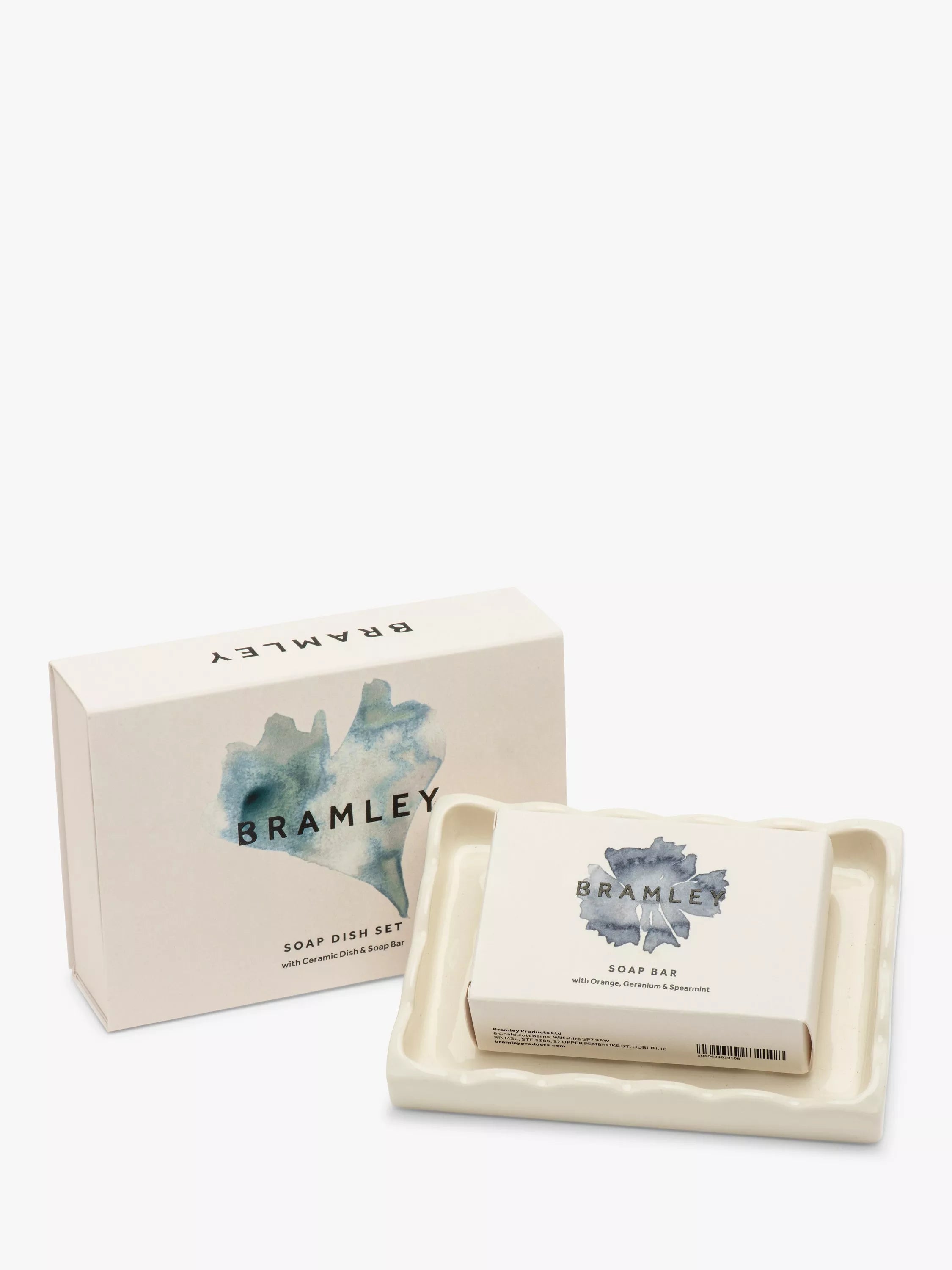 This pretty ceramic soap dish, based on one of Chloë's, Bramley's founder's designs, has been created in one of the oldest potteries in Stoke-on-Trent. Inside the dish is the Hand & Body Bar, with essential oils of sweet orange, geranium & spearmint, perfectly hand-sized so easy & comfortable to use.