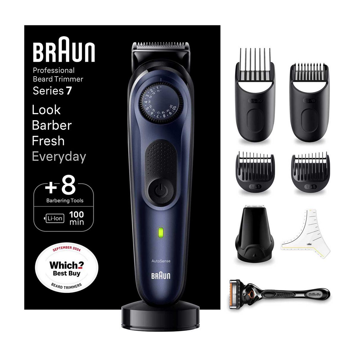 Get barber-fresh results at home with Braun’s professional Series 7 Beard Trimmer. Precise in every stroke with our sharpest ProBlade. Autosense ensures evenness for all beards. ProWheel with 40 length settings. 100-min cordless runtime.