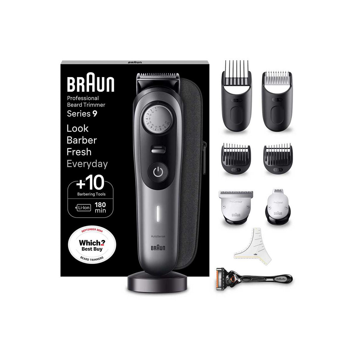 Get barber-fresh results at home with Braun’s professional Series 9 Beard Trimmer. Precise in every stroke with our sharpest ProBlade. Autosense ensures evenness for all beards. ProWheel with 40 length settings and ProLock. 180-min cordless runtime. Box Content: 1x Beard trimmer incl ProBlade trimmer head 1x Detail Pro head 1x Contour pro head 1x Precision beard comb (0.5 – 10 mm) 1x Precision hair comb (10.5 – 20 mm) 1x Beard fading combs 1x Gillette Proglide razor 1x Gillette Proglide cartridge 1x Charging stand 1x Beard stencil 1x Cleaning brush 1x Travel case