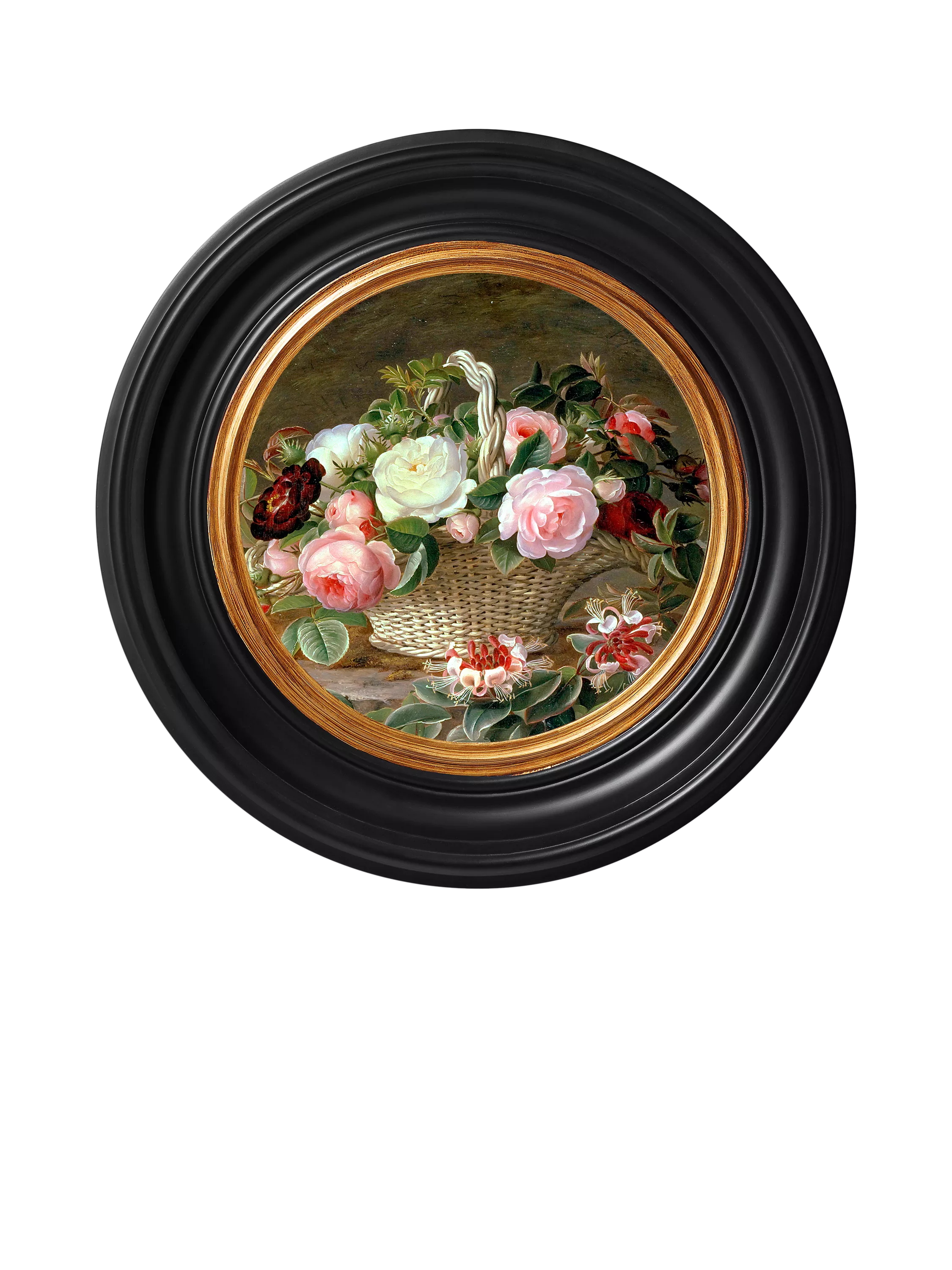 A vintage-style floral print. Made in the UK, with the use of both up-to-date technology and skilled craftsmen, this unique and high-quality picture captures all the colour, craquelure, texture and character of an original painting. Set in a round wooden, antique-style black and aged-gold frame, ready to hang on your wall.