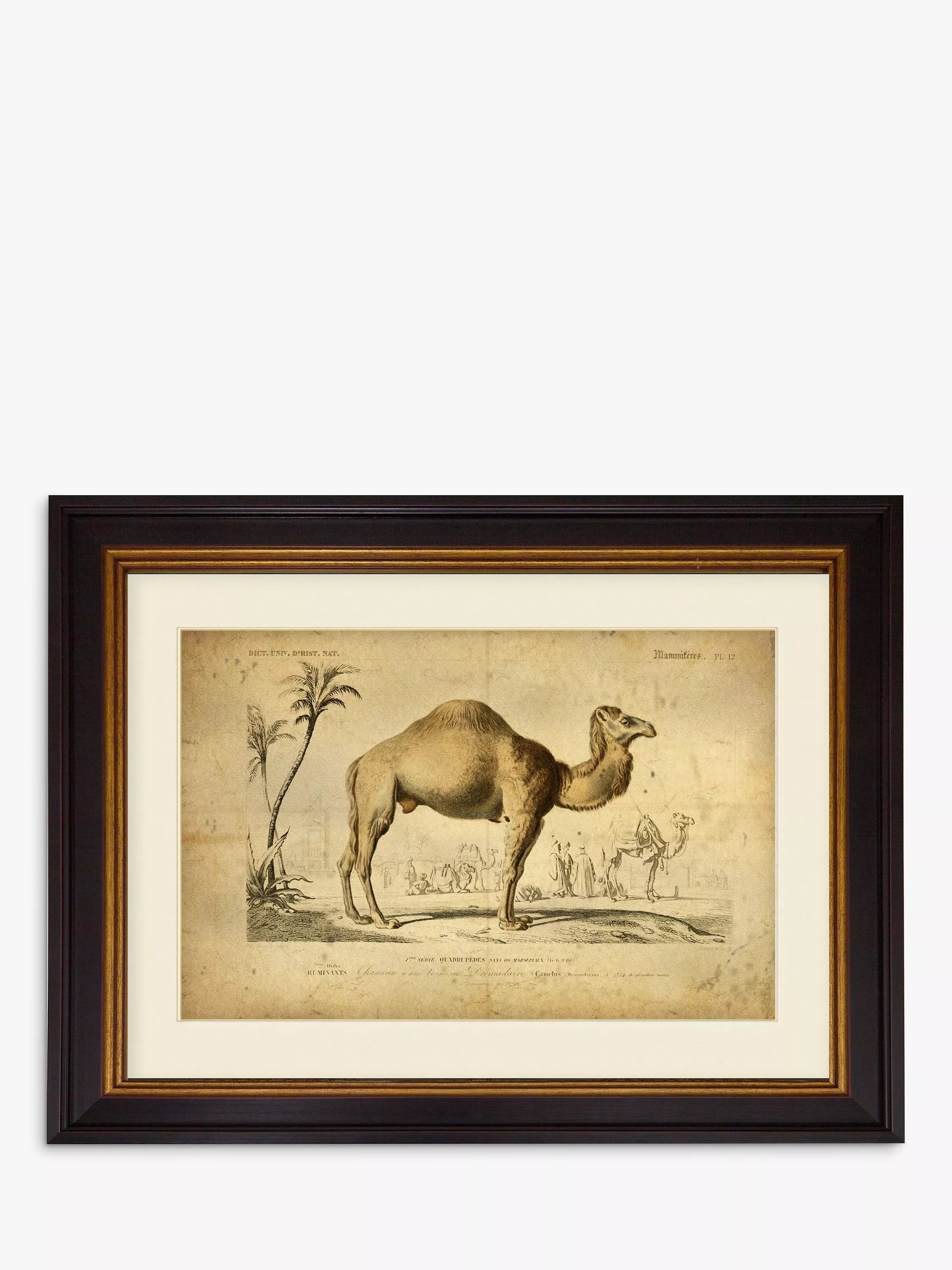A vintage-style print illustration of a camel. Presented with a mount and a dark wood-effect frame with an inner gold rim.