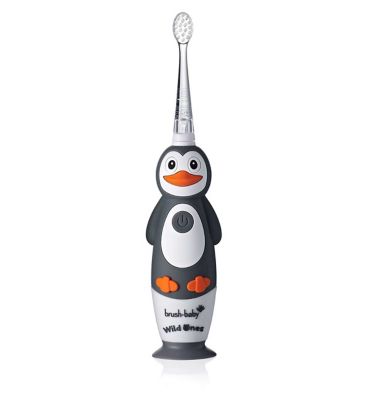 This Brush-Baby WildOnes Penguin rechargeable toothbrush makes daily oral hygiene enjoyable for young users. Its engaging character design captures attention, encouraging them to use the device consistently during their routine. This electric tool is specifically engineered to fit comfortably in small hands while providing effective cleaning action.