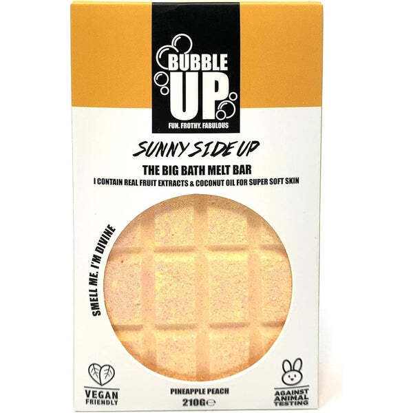 Discover the Bubble Up Bath Oil Melt Soap Bar, presented in a large 210g format for your enjoyment. This premium soap is carefully scented with a bright blend of Pineapple and Peach, transforming your daily wash. It provides a unique texture experience as it melts during use.