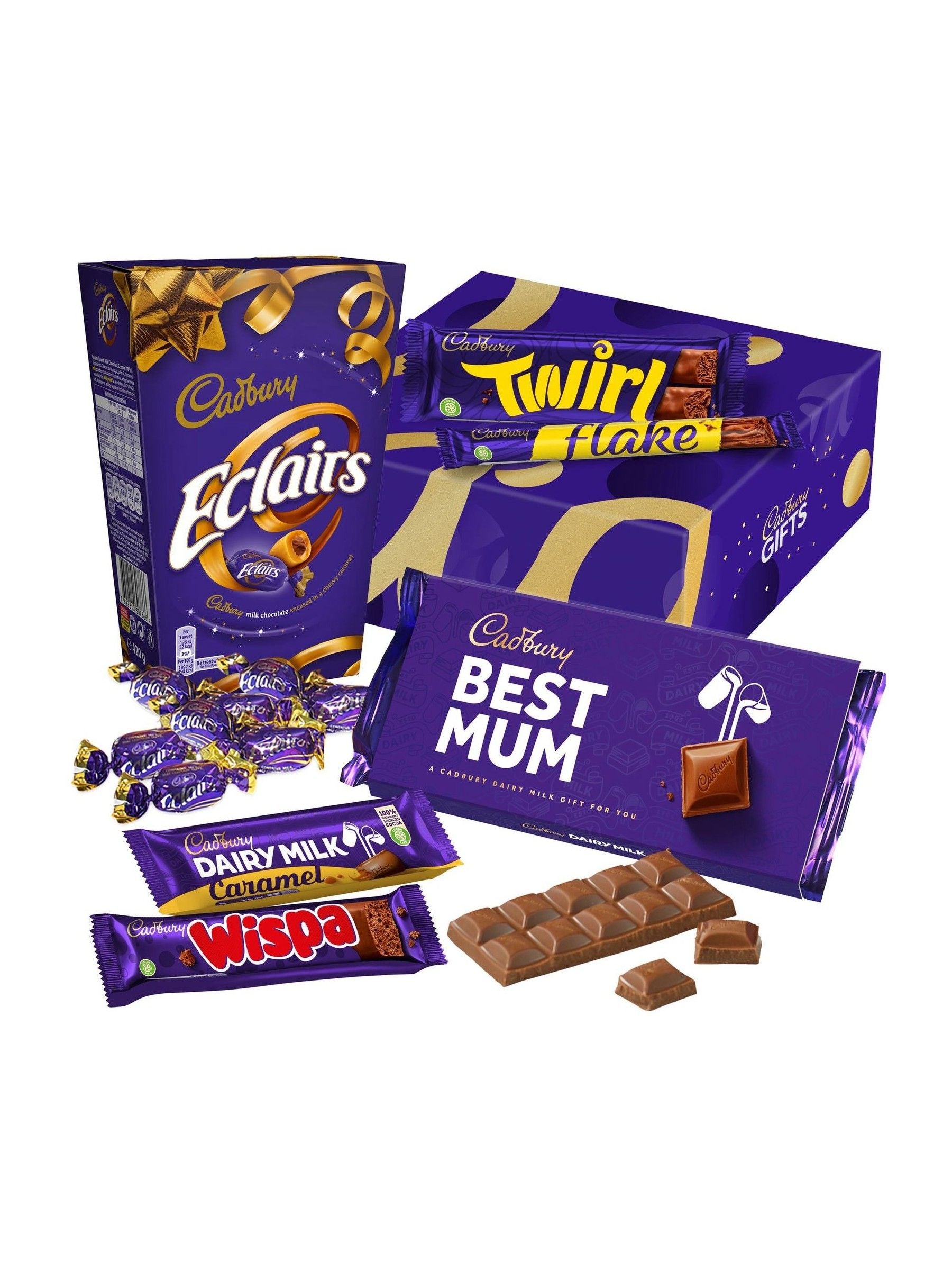 Cadbury Best Mum Chocolate Gift contains; 1 x Cadbury Dairy Milk Chocolate Bar 110g with Best Mum Sleeve 1 x Cadbury Eclairs Carton 350g 1 x Cadbury Wispa Chocolate Bar 36g 1 x Cadbury Flake Bar 32g 1 x Cadbury Crunchie Bar 40g 1 x Cadbury Dairy Milk Caramel Bar 45g