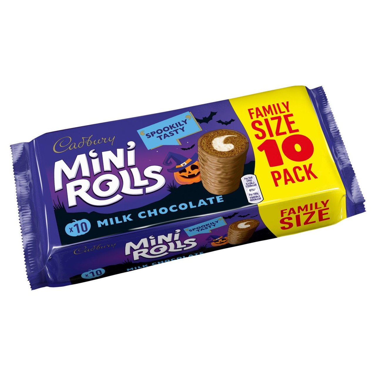 Enjoy the classic taste of Cadbury Mini Rolls, perfect for sharing in this family-sized pack. Each mini roll combines a moist chocolate sponge cake and a sweet vanilla flavour filling. The entire treat is finished with a coating of famously smooth Cadbury milk chocolate.