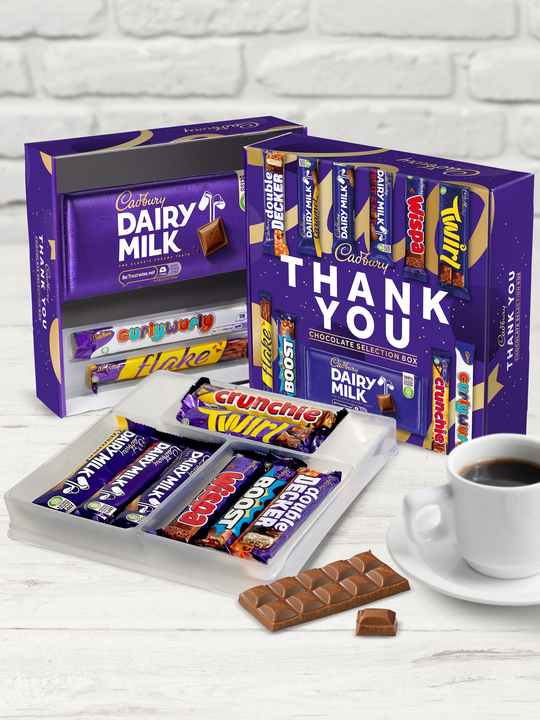 Thank You Double Deck Selection Box contains 1 x Cadbury Dairy Milk Chocolate Bar 110g, 1 x Cadbury Dairy Milk Chocolate Bar 45g, 1 x Cadbury Dairy Milk Caramel Bar 45g, 1 x Cadbury Dairy Milk Fruit & Nut Bar 49g, 1 x Cadbury Crunchie Bar 40g, 1 x Cadbury Twirl Bar 43g, 1 x Cadbury Flake Bar 32g, 1 x Cadbury Curly Wurly Bar 21.5g, 1 x Cadbury Wispa Bar 36g, 1 x Cadbury Boost Bar 48.5g and 1 x Cadbury Double Decker Bar 54.5g.