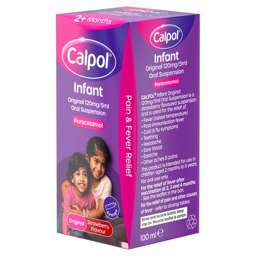 This Calpol Infant Oral Suspension offers reliable pain and fever relief suitable for young children. The product features a pleasant strawberry flavour, making administration easier for infants aged two months and older. It is formulated to address common childhood discomforts, including aches, colds, and high temperatures.
