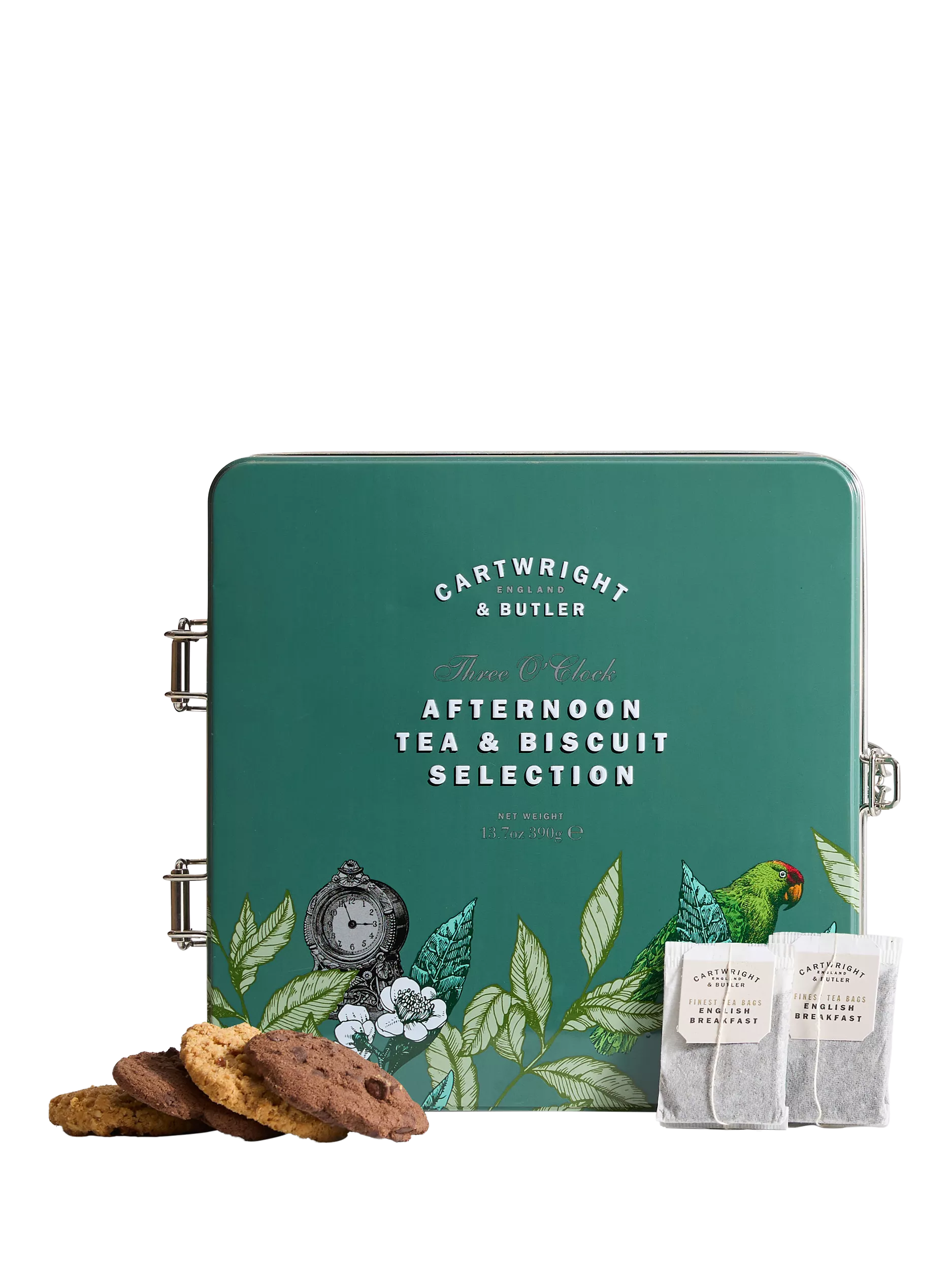 Cartwright & Butler's Afternoon Tea and Biscuits Selection is an extra special gift that can be enjoyed long after the delicious products have been devoured. Presented in a beautifully illustrated clip lid tin, offering a selection of two tasty biscuits; Chocolate Brownie Biscuits and Sea Salted Caramel Oat Crumbles and, the perfect companion to the delicious biscuits, English Breakfast Tea.