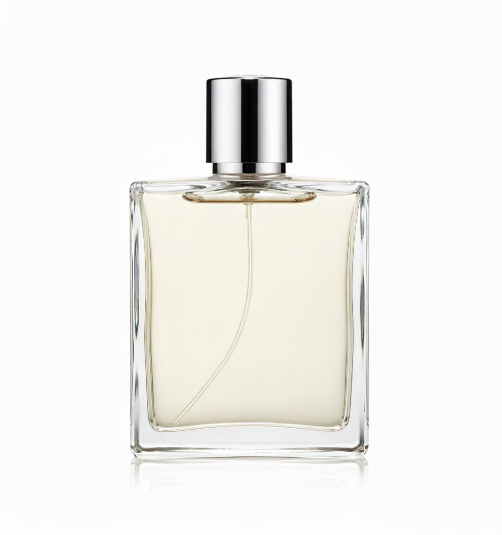 • Housed in a clear, rectangular glass bottle with modern accents.