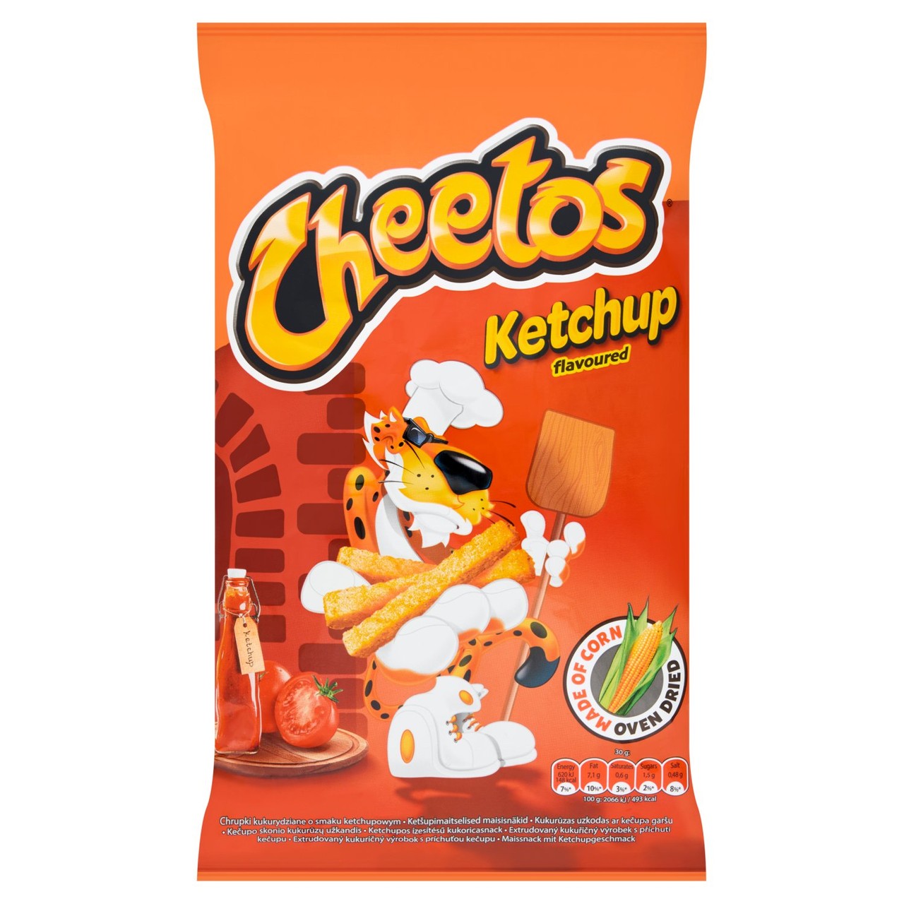 Enjoy the distinct, tangy taste of Cheetos Ketchup Flavour Corn Snacks. These savoury, extruded puffs are crafted from oven-dried corn, delivering a satisfying crunch with every bite. This classic snack features the expected Cheetos texture enhanced by a sweet and sour ketchup seasoning blend.