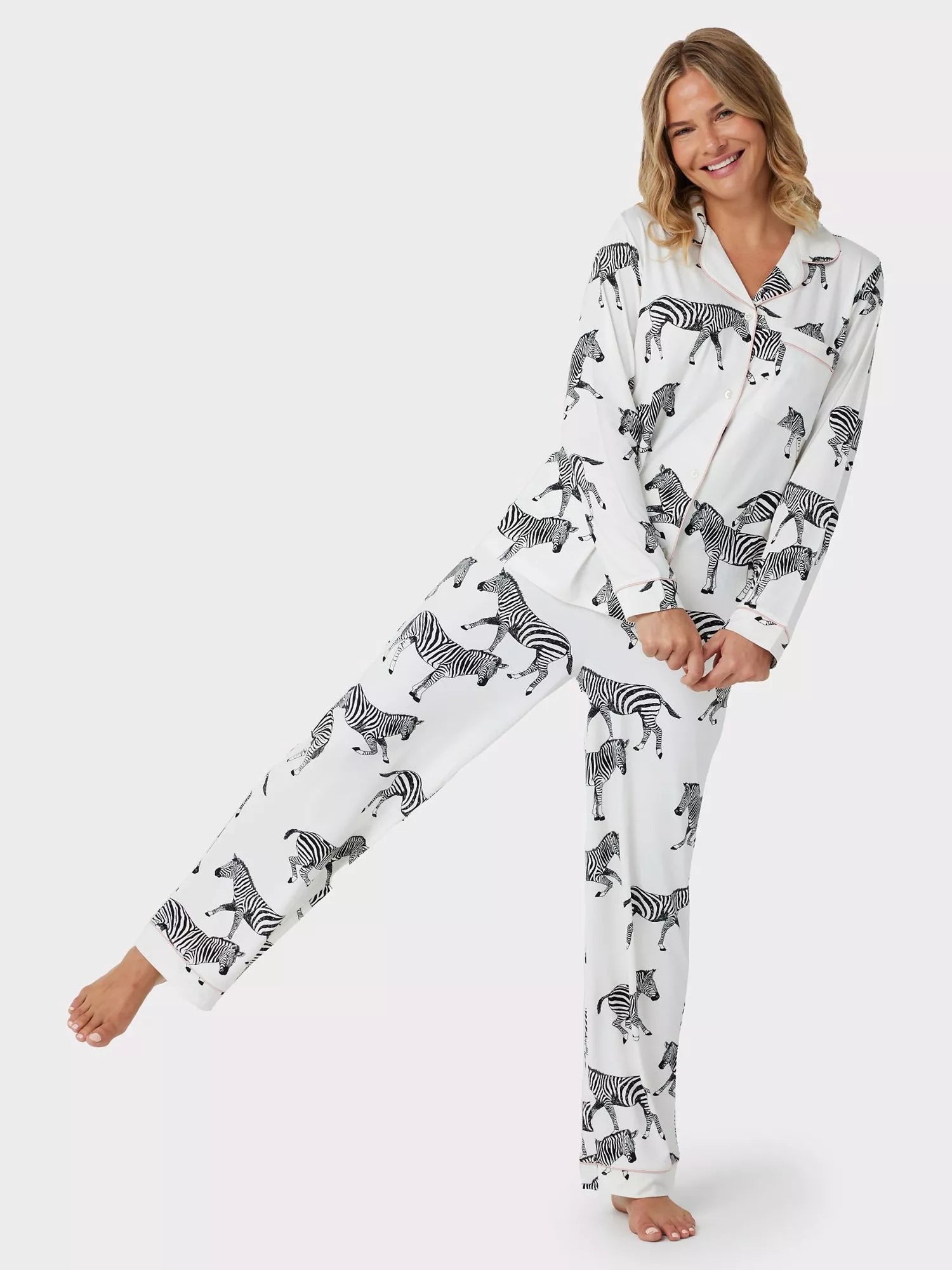 Incorporating their signature grazing zebras, this pyjama set from Chelsea Peers is both comfortable and practical. Made from soft recycled jersey fabric, the long-sleeved top and matching trousers are just the thing for a good night's sleep.