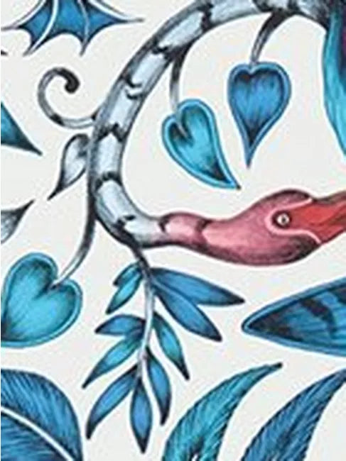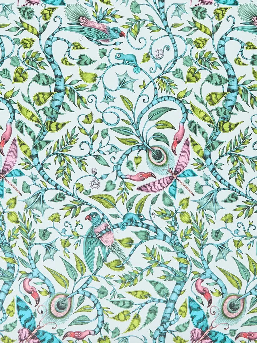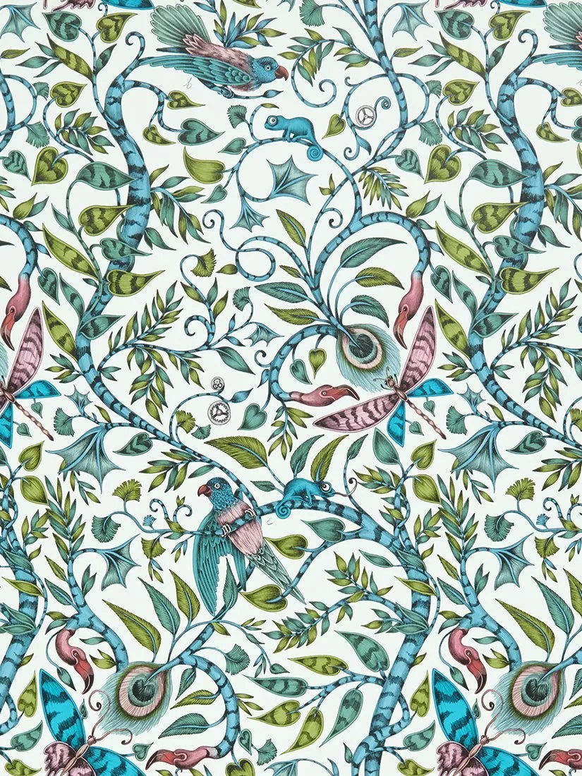 This design features an intricately hand drawn pattern of winding foliage, peacock feathers and curious small birds and creatures.