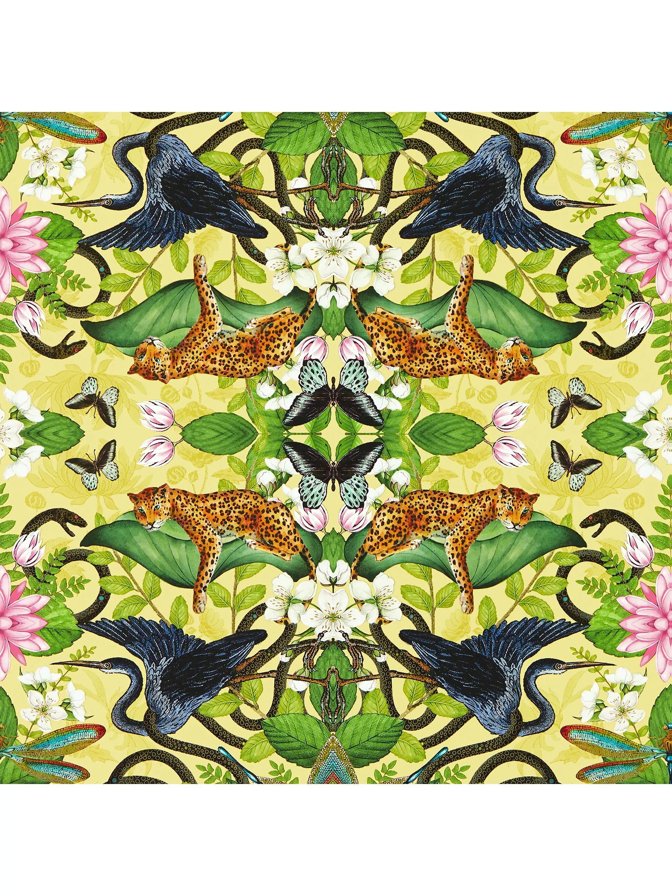 From the Amazon basin's tropical heat, to the humid jungles of Vietnam, harness the spirit of wanderlust and discover exotic, uncharted territories. Celebrating the world s most unusual flora and fauna, make a statement with this bold, kaleidoscopic wallpaper as it encounters butterflies, birds, leopards and snakes hidden amongst unexpected patterns.None
